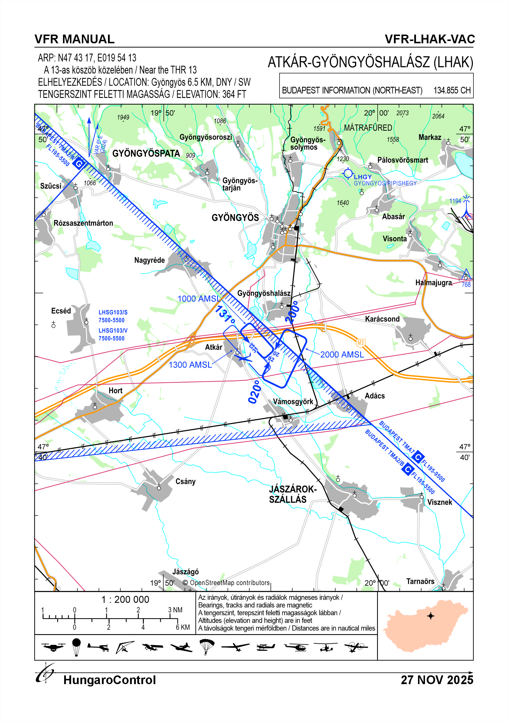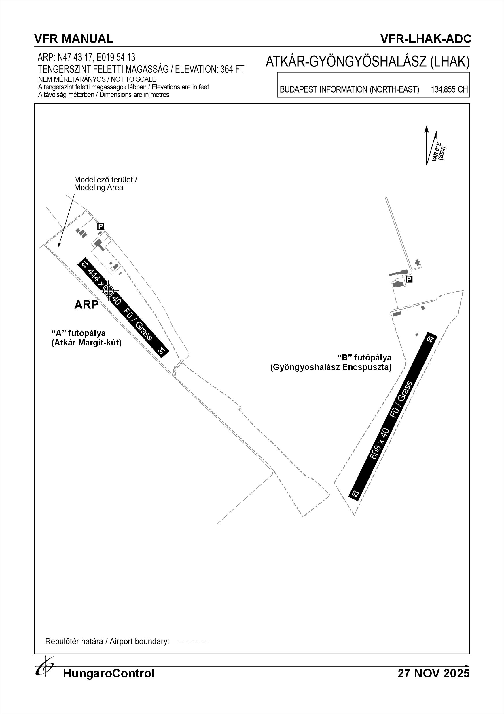 The Airport has two runways. The west side has runways 13-31 and the east side has runways 02-20. The activities that can be performed at the airport together are: glider, (towed, beaked and self-launched), hang glider, UL, powered. Hot-air ballooning and ballooning activities can be separated in time. Separately in space, RC model aircraft activity may be conducted in the area at threshold 13 and simultaneously at a maximum distance of 200 m from threshold 31. Paragliding activities may be conducted. In the case of flying operations on any runway, the adjacent runway shall be shall be notified by telephone or in person 1 hour before the commencement of the flight. If the notification fails for any reason, the operator of the current runway shall the person responsible for the operation to be held at the current operating point must personally ensure that the other the other runway is clear of any flying activity. Crossing the M3 motorway and flying north of it below 150 m /500 ft AGL is prohibited. In the event that there are only two types of aircraft operations at the airport, they will always fly school circuits in opposite directions. In addition to powered aircraft and sailplanes, unpowered aircraft may fly school circles in the same direction as sailplanes, while powered/assisted aircraft may fly school circles in the same direction as powered aircraft. Modelling activities may only be conducted in a designated area near runway 13-31 up to 120 metres in height. In the case of a flying operation, the participants in the modelling operation must have radio contact. Model flights shall be stopped, aircraft departures and arrivals shall be the arrival and departure of aircraft. Model aircraft are NOT allowed to fly over facilities or parked aircraft. Only aircraft the commander of which has received permission from the operator or owners, or their designate, to use the aerodrome may use the aerodrome. The coordination of daily operations shall be organised on a day-to-day basis by the accountable manager or his/her deputy, depending on the weather and the operation or operations. The operator shall endeavour to keep wild animals out, but their presence cannot be excluded. Only VFR flights are allowed on the airport. For further information, please consult the current Airport Rules.